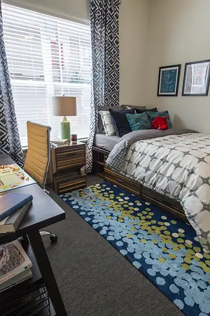 Individual leasing means peace of mind for both parents and students. An individual lease means you are only responsible for your student’s space, not the full apartment as a typical joint lease would be structured. Common areas are shared responsibility among all roommates (ie, living room, kitchen, etc.). Our term lease structure is a lease that begins on a specified date and ends on a specified date, for one fee. This fee is conveniently administered in 12 installments.