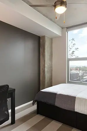 Individual leasing means peace of mind for both parents and students. An individual lease means you are only responsible for your student’s space, not the full apartment as a typical joint lease would be structured. Common areas are shared responsibility among all roommates (ie, living room, kitchen, etc.). Our term lease structure is a lease that begins on a specified date and ends on a specified date, for one fee. This fee is conveniently administered in 12 installments.
